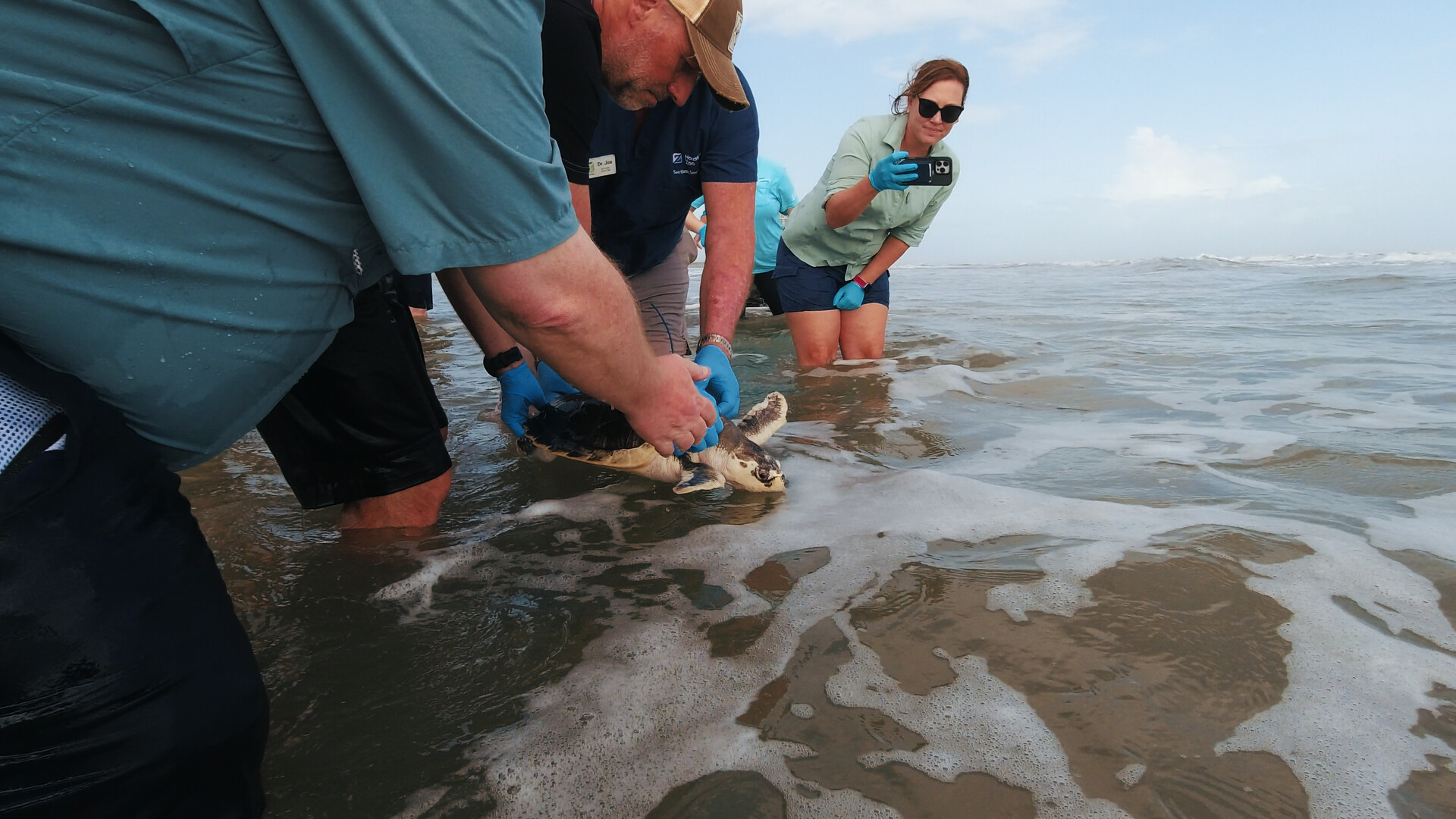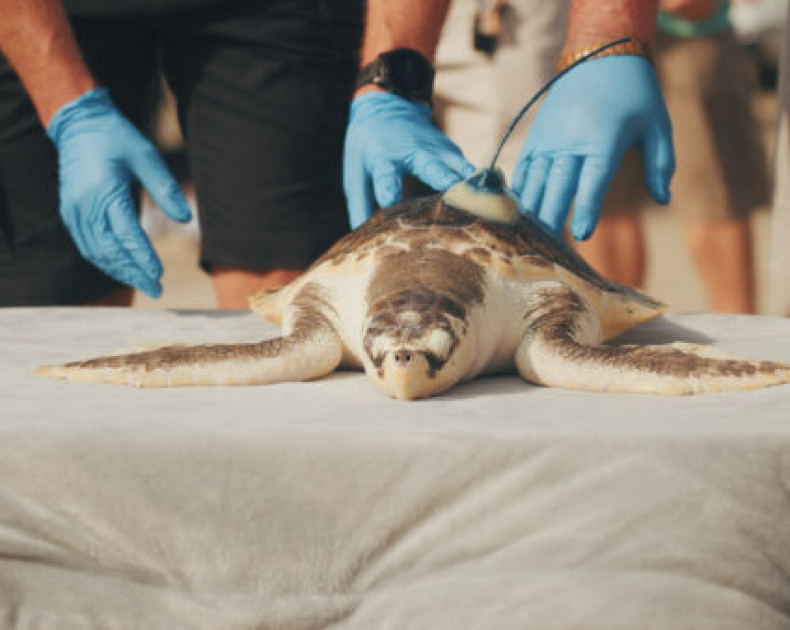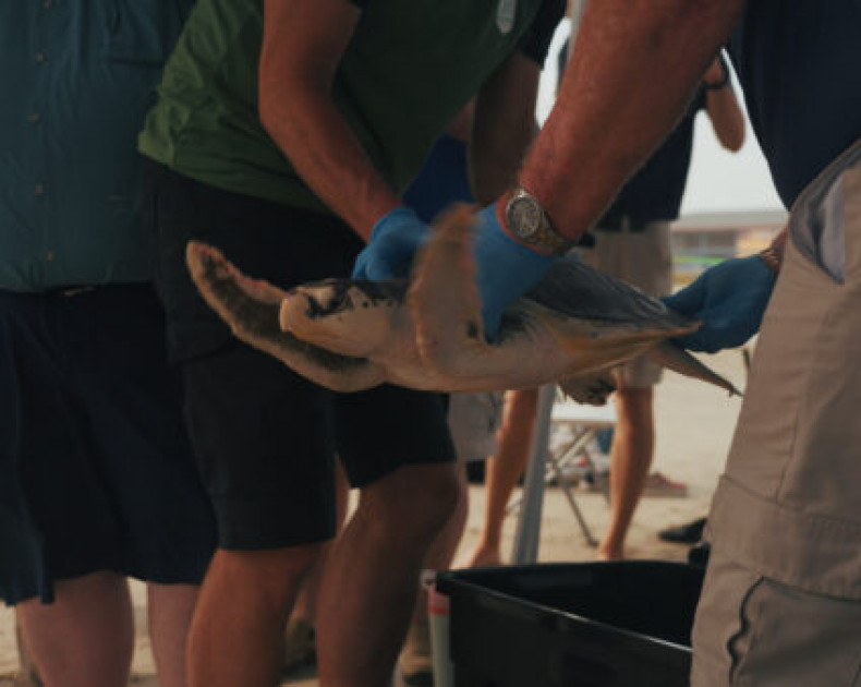Dit aangespoelde Kemps zeeschildpad — een ernstig bedreigde diersoort — wordt klaargemaakt om weer terug naar zijn natuurlijke habitat te gaan.